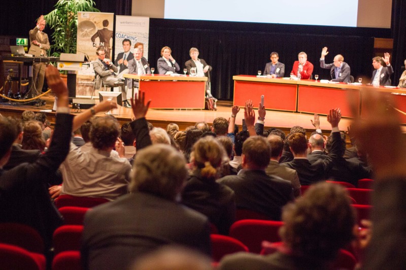 Uiteindelijk is het hele voorgaande dagprogramma ontworpen om te meanderen naar de finale interactieve sessie (nog steeds in vier groepen) en aanvullende discussie (plenair). In deze tweede sessie is namelijk ons huidige systeem grondig onder de loep genomen. Onder het toeziend oog van visionaire sprekers zoals Ronald Doornbos, Jos Berkemeijer, René van der Meer (als invaller voor de zieke Rajish Sagoenie) en Pieter Marres werden verscheidene stellingen geponeerd, welke vervolgens samen met de zaal geanalyseerd zijn. Deze zelfde vier sprekers (met uitzondering van René van der Meer, welke door John Smolenaers vervangen werd) hebben vervolgens aan de discussietafel plaatsgenomen om hun bevindingen te bespreken en te trachten een consensus te vinden over de meest essentiële stappen die Nederland moet ondernemen om weer top of the table te worden, of in ieder geval niet verder af te zakken. Deze discussie werd tevens geassisteerd door onze ‘Commissie van Repliek’, bestaande uit alle plenaire sessie sprekers (behalve Theo Kocken die naar London vertrokken was om wat meer schedels te verpulveren), Siert Jan Vos van de UvA en Sameer van Alfen van het Financieel Dagblad, welke geinstalleerd werd om de discussie zo alomvattend mogelijk te maken.